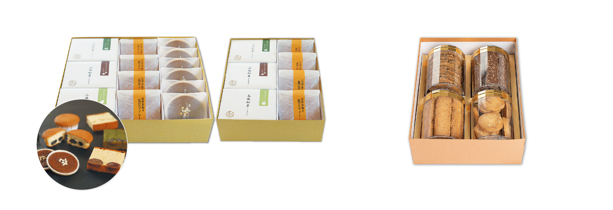 [内容]窯出しカステラ3種(濃口抹茶/渋川栗/ラ・フランス)・山形米粉の黒豆マドレーヌ・もなかショコラ(5種詰合せのみ)
