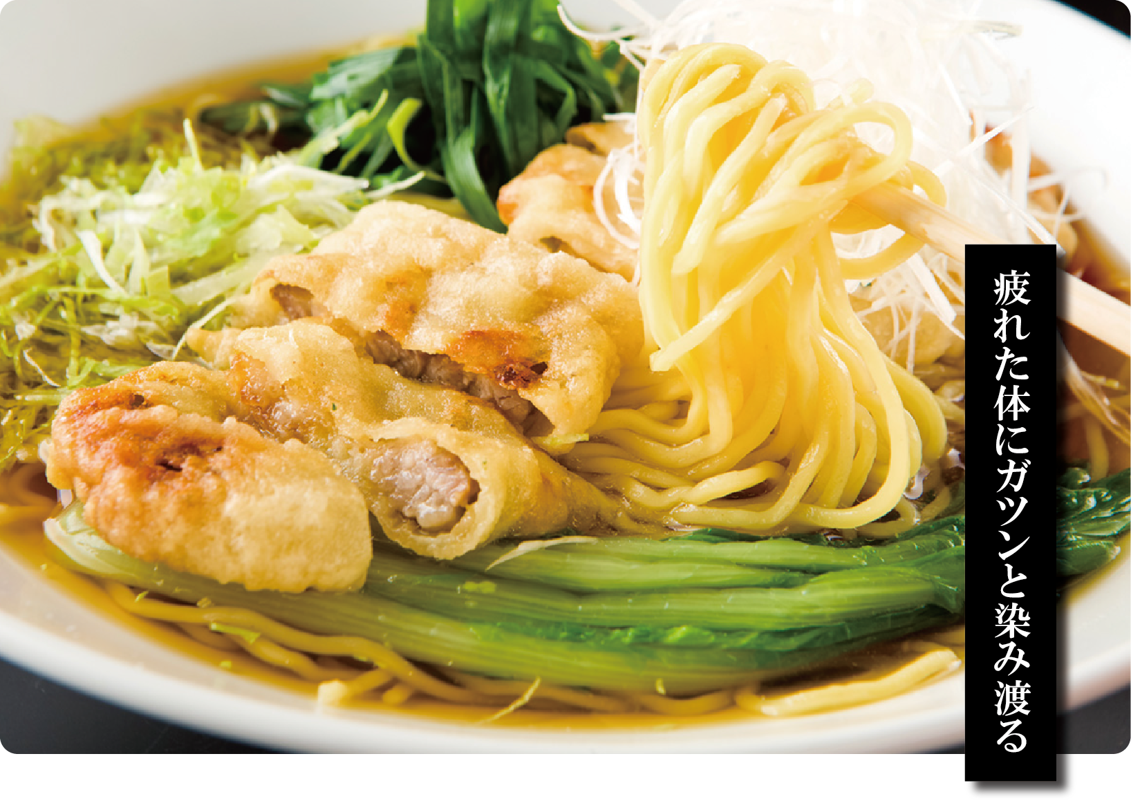 山形県金山町で育ったブランド豚「米の娘豚」を使用。カレー粉香る秘伝のたれに付け込んだパ―コ―(豚唐揚げ)をカリッと揚げ、うま味たっぷりのスープと合わせました。