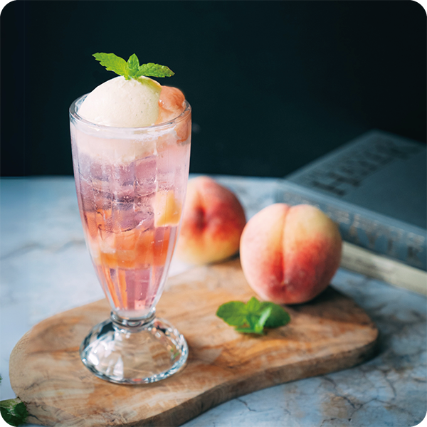 ごろっと贅沢な桃の果実とバニラアイスを添えて、クランベリージュースで爽やかに仕上げました。