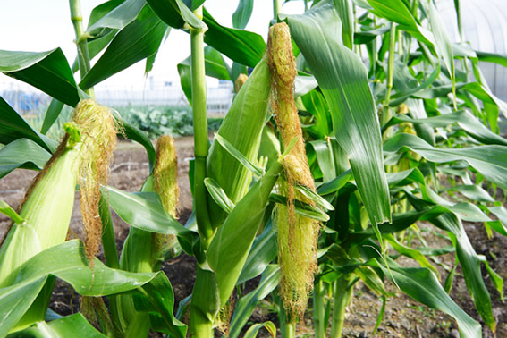 有機野菜の畑で育ち、新鮮で取り立ての元気なトウモロコシを使用