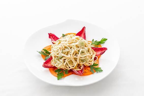 蓮の花をかたどり干し豆腐と搾菜、香り高い青葱花ソースのさっぱり冷菜。敦煌の仏の地・莫高窟の静けさを表した一皿です。