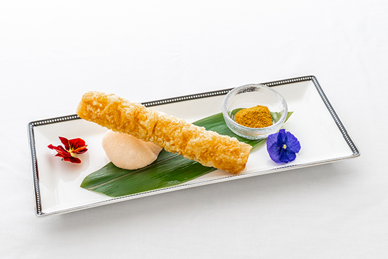 孫悟空の如意棒をイメージした、カリッと香ばしい海老春巻き。旅の終着地・ガンダーラ地方のスパイス文化を感じさせるカレー塩を添えました。
