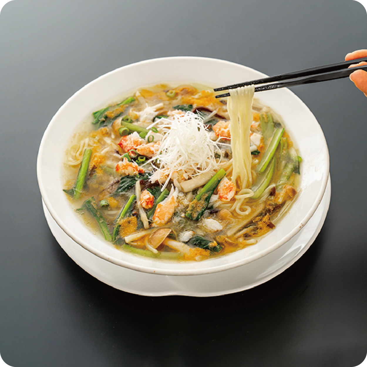 気仙沼産の極上フカヒレを贅沢に使った「フカヒレ入り贅沢つゆそば」は、コラーゲンたっぷりで滋養豊かな味わいが広がります。上海ガニの濃厚な蟹味噌が深い旨味を引き立てる「上海蟹みそ餡かけつゆそば」は、山海の幸が織り成す贅沢な一皿。寒い季節にぴったりな、心も体も温まる極上の美食体験をお届けします。