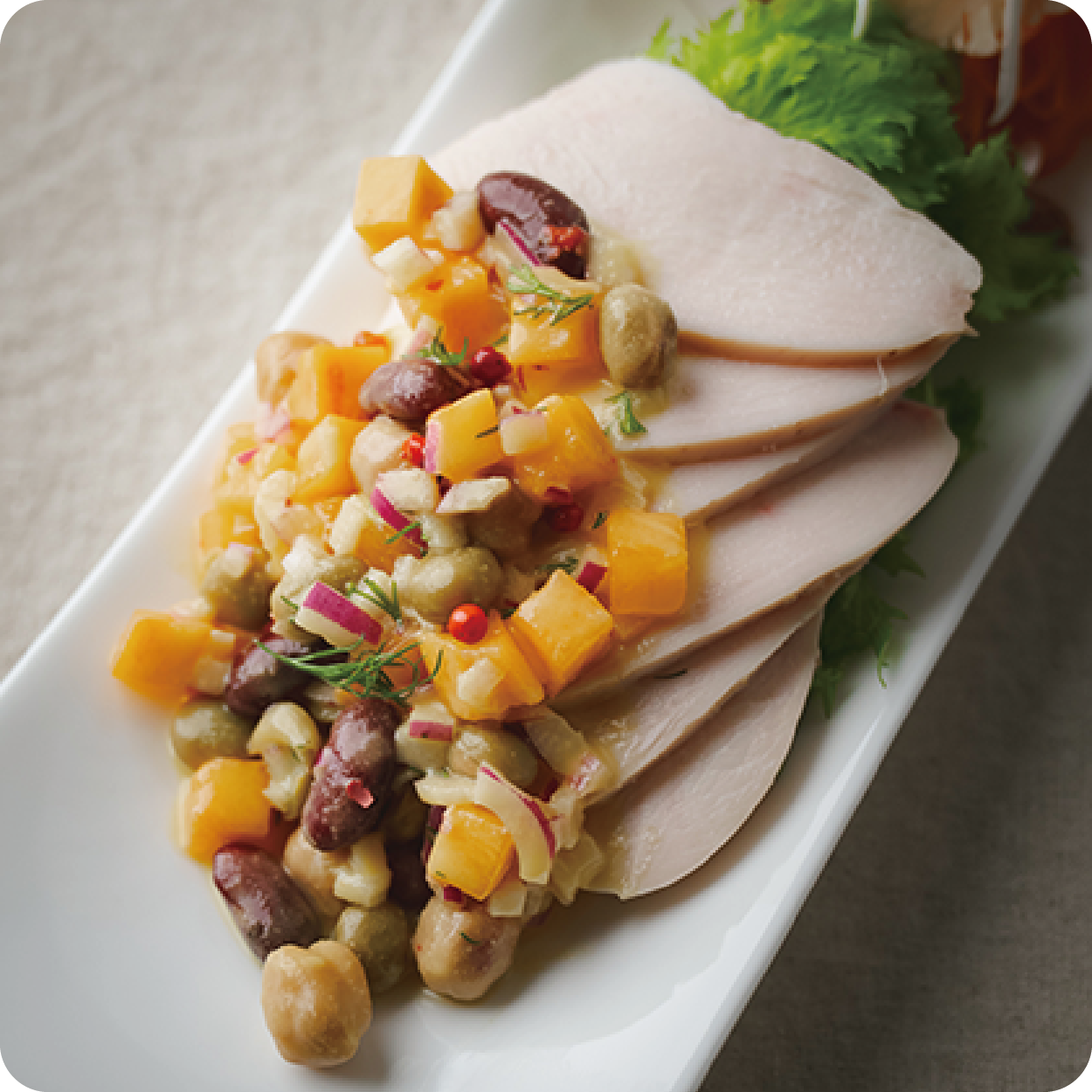 しっとりと火を入れた鶏胸肉に、柿とミックスビーンズを合わせた“食べるドレッシングサラダ”