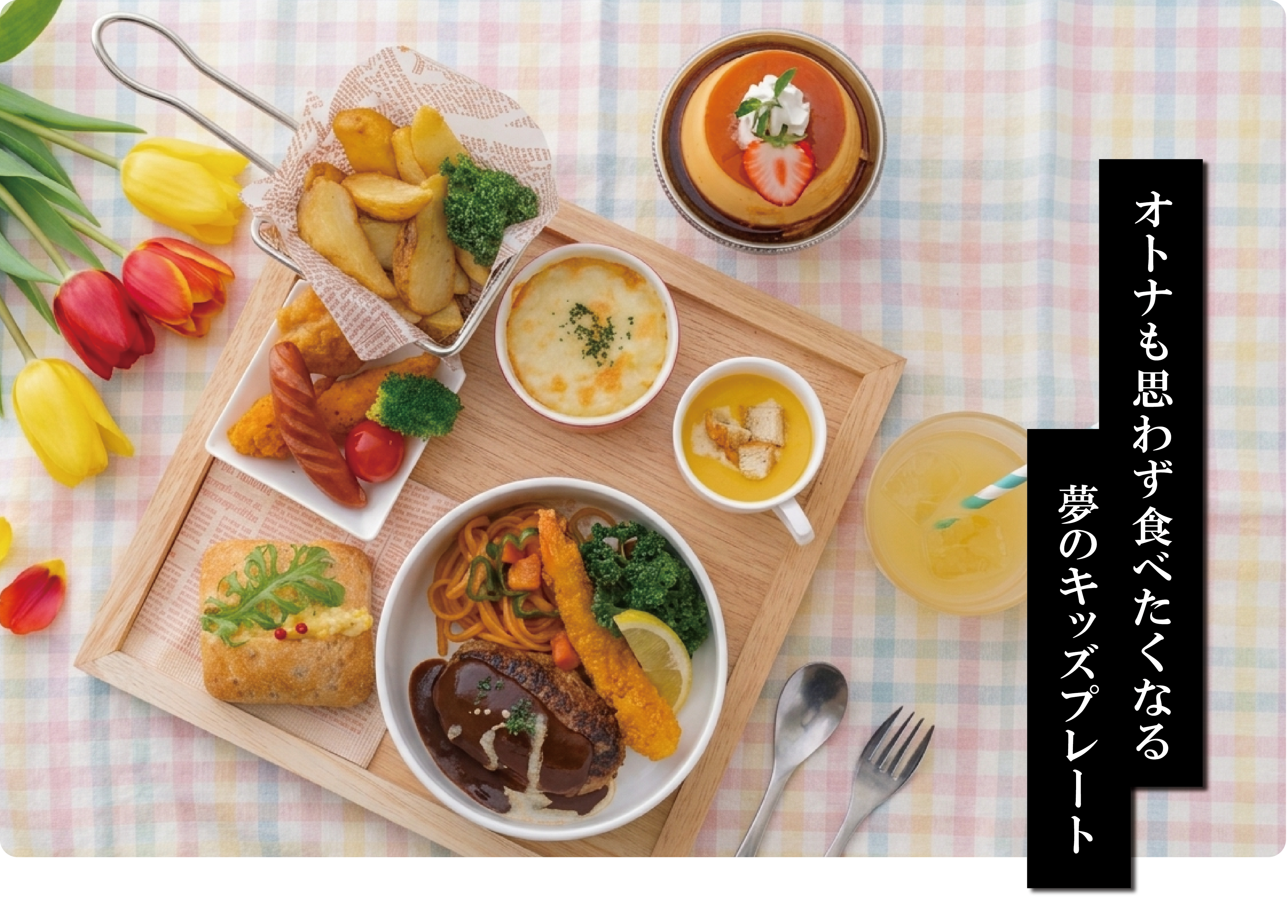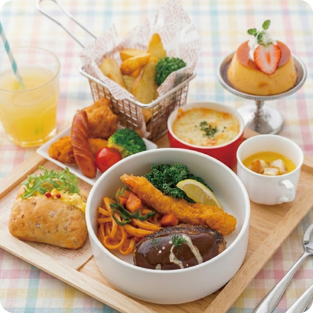 サクッと揚げたエビフライやナポリタンなど、お子様にうれしい7つのメニューを揃え、お腹いっぱいになるまでお召し上がりいただけます。