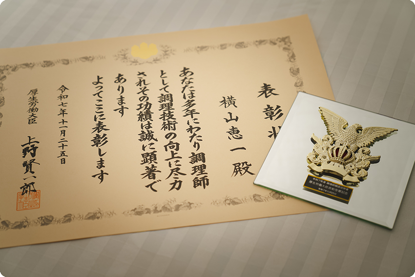 今回の受彰は、横山料理長の長年にわたる継続的な努力と研鑽の賜物です 。