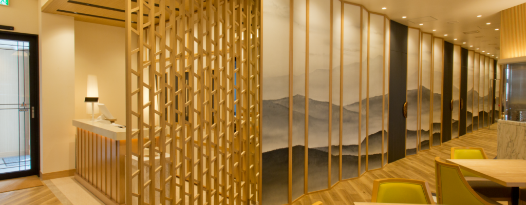 そして何よりも、地元の方により親しんでいただきたいと願い、出羽三山の屏風 風壁面を設けました。山形の皆様にとって、大切な拠り所でもある出羽三山のように、この店に集い、共に食する事で、楽しみ、そして喜びに満ちあふれ、日々の活力の源になりますように。